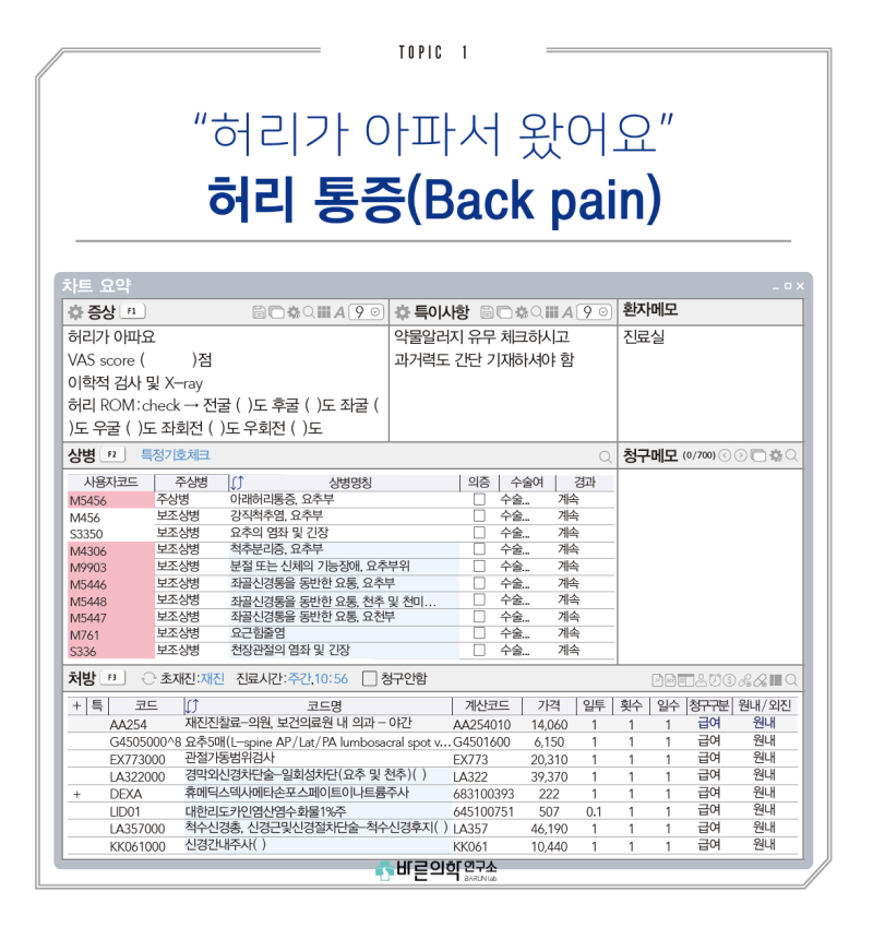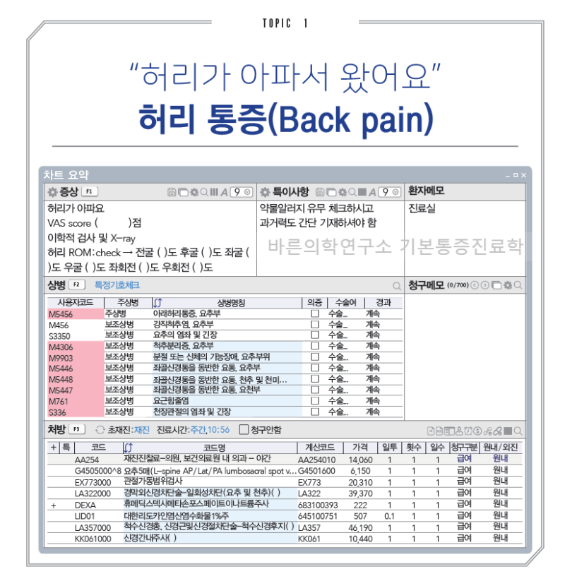 안녕하세요 바른의료연구원입니다. 오늘은 PART 8.Back Topic 1 기본통증치료의 “허리통증”에 대한 내용입니다. 먼저 PART 8 카달로그부터 보시겠습니다~
