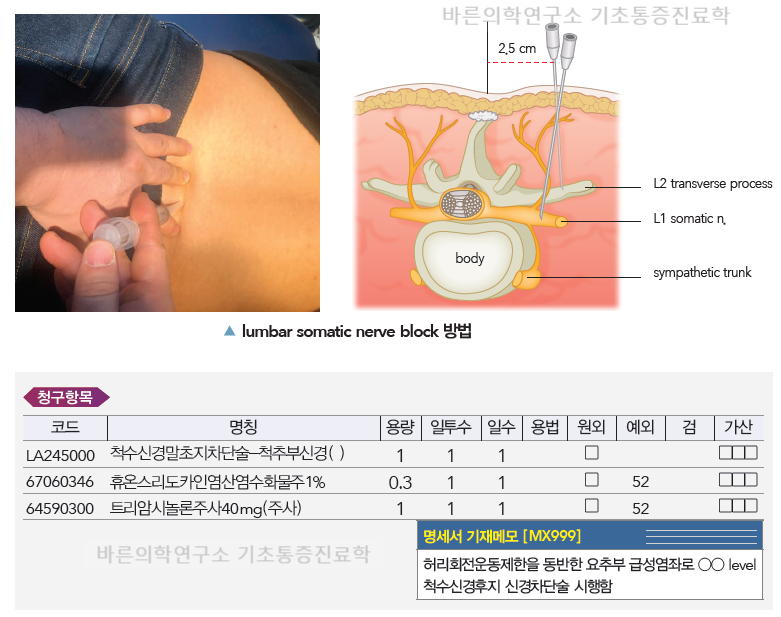 자세한 내용은 247페이지의 기본 통증 관리를 참조하십시오. LA248000 늑간차단 및 붕대 T6161 PDNB(후척추신경차단) LA245000 요근구획차단 LA253000 천장관절차단 LA359000: C-arm 필요 Claimable Prolotherapy TPI MM131 근막통증 유발점 주사 자극 요법 4) 식이 요법 5) 운동 요법 6) 테이핑 요법 기본적인 통증 치료법이 궁금하시다면 닥터킹의 기본 통증 치료법 아래 링크를 통해 학기를 만나보실 수 있습니다. https://www.youtube.com/watch?v=VN08v4M7lRM